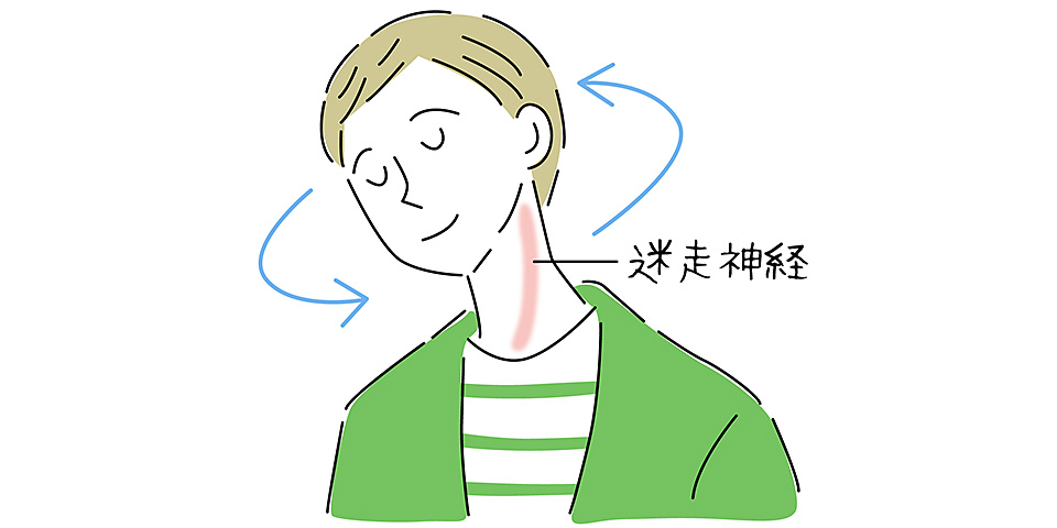 首を大きくゆっくりのばすようにして回すと、首周りの神経(副交感神経系である迷走神経)が刺激され、リラックスしやすくなる。